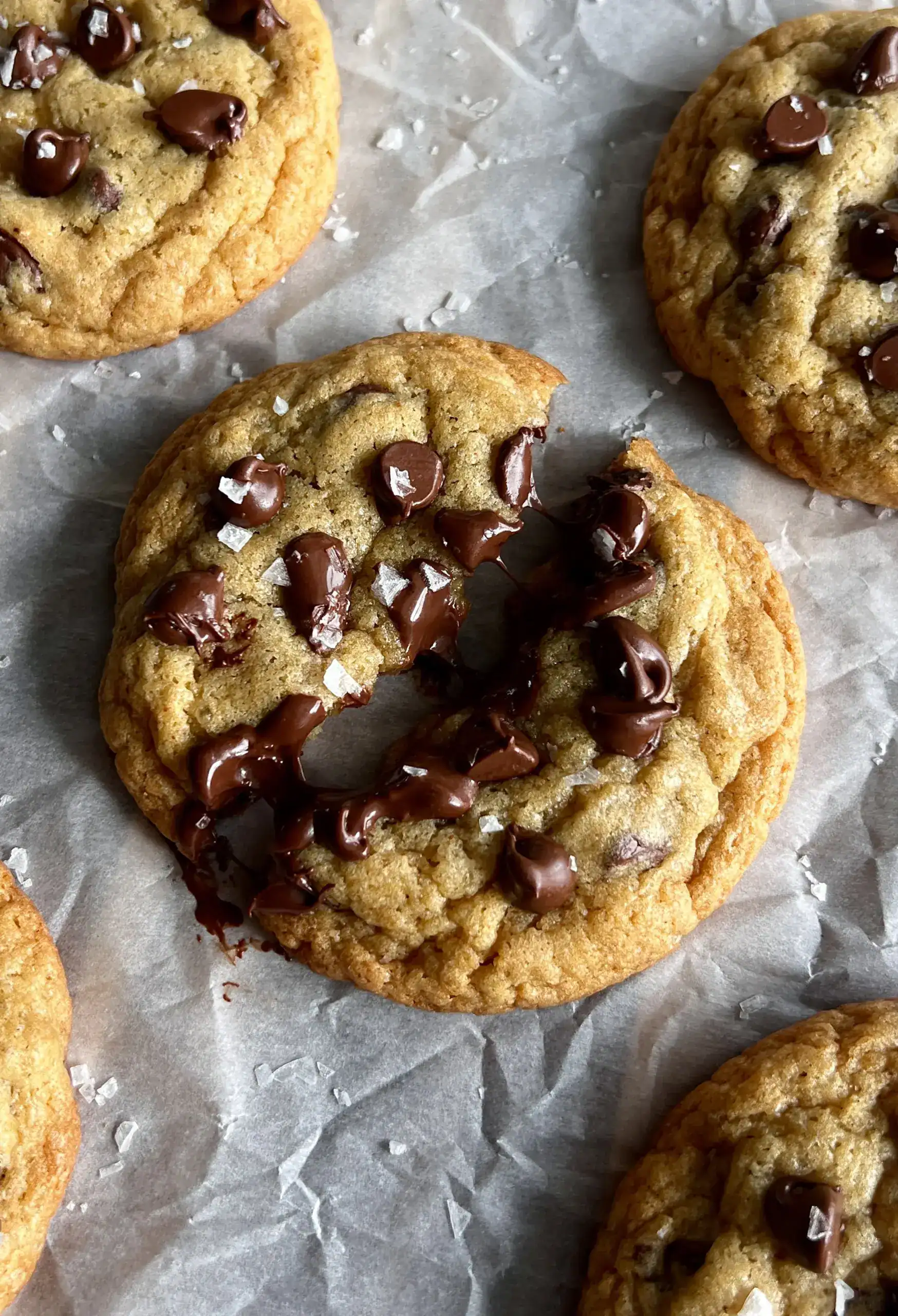 Chewy, golden-brown edges with a gooey center, sea salt, and pools of dark chocolate.